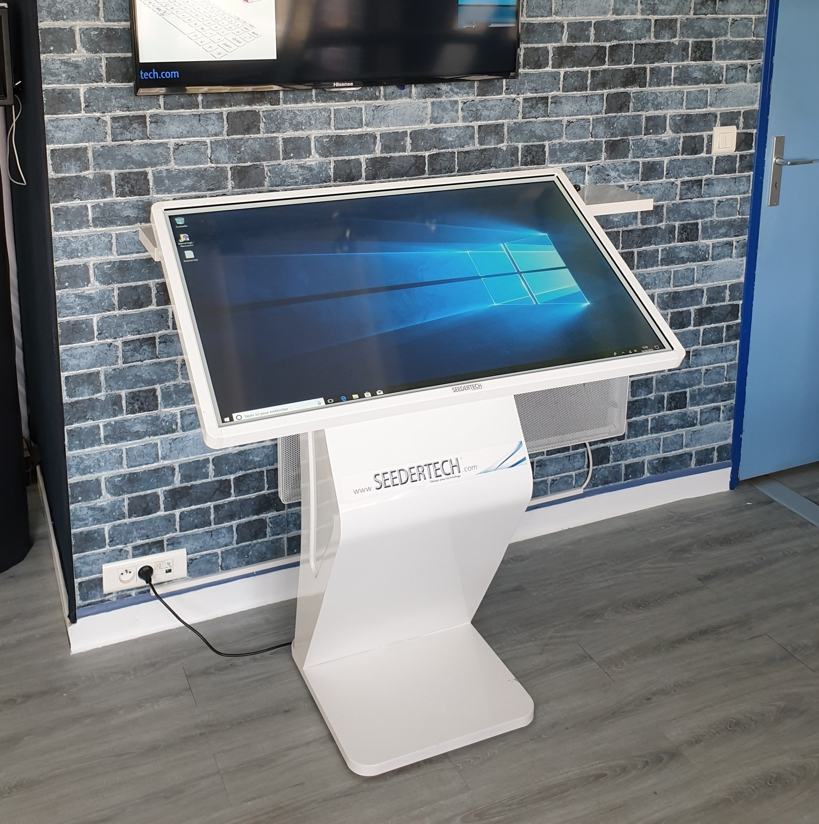 It is a desk with a contemporary design, designed in painted metal with a 42/43 inch touch screenprotected by a tempered glass plate.
